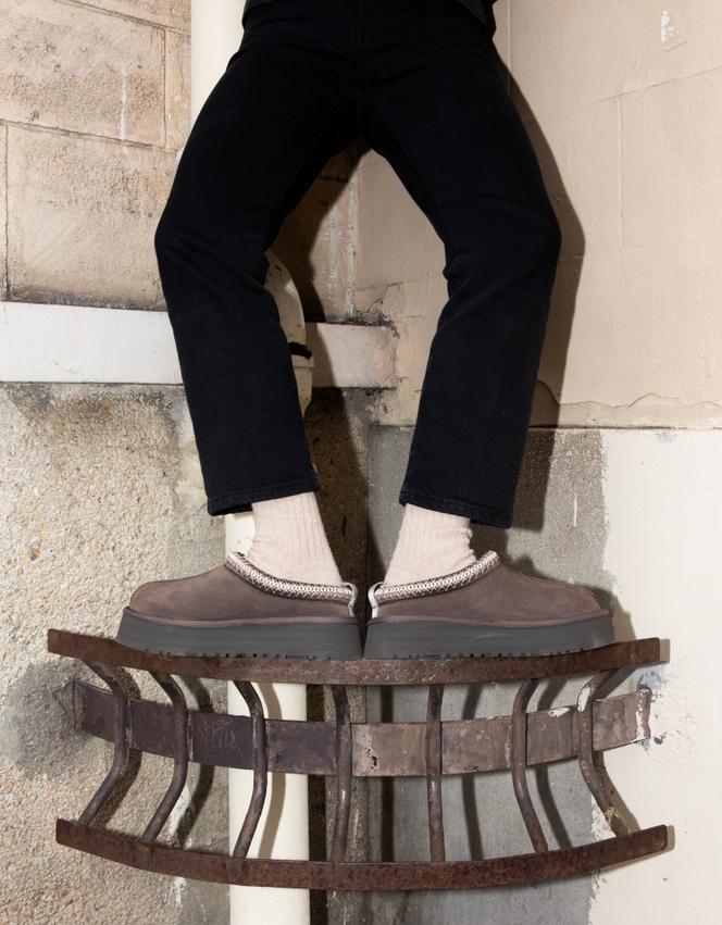 Les chaussons plateformes en daim Tazz,de la marque UGG. TANGUY SERGHERAERT POUR « LE MONDE » Poilues,rebondies,fourrées,gonflées à l’hélium… Cet hiver,il suffit de baisser le regard pour être frappé par un drôle de phénomène : ponctuant des silhouettes,de singulières chaussures àl’alluremoelleuse,traînante et silencieuse,glissent sur l’asphalte. En 2024,les cendrillons ont troqué leurs pantoufles de vair pour celles en shearling (peau de mouton avec sa laine,vraie ou fausse) ou tout autre matériau doux et isolant.